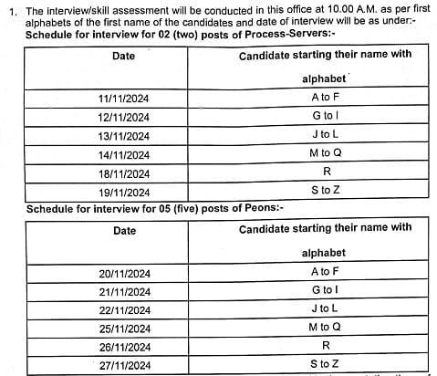 The Interview for posts of Peon, Process Server Candidate should report for checking of testimonials/Interview at Judicial Court Complex, Bathinda at 10:00 AM on following dates