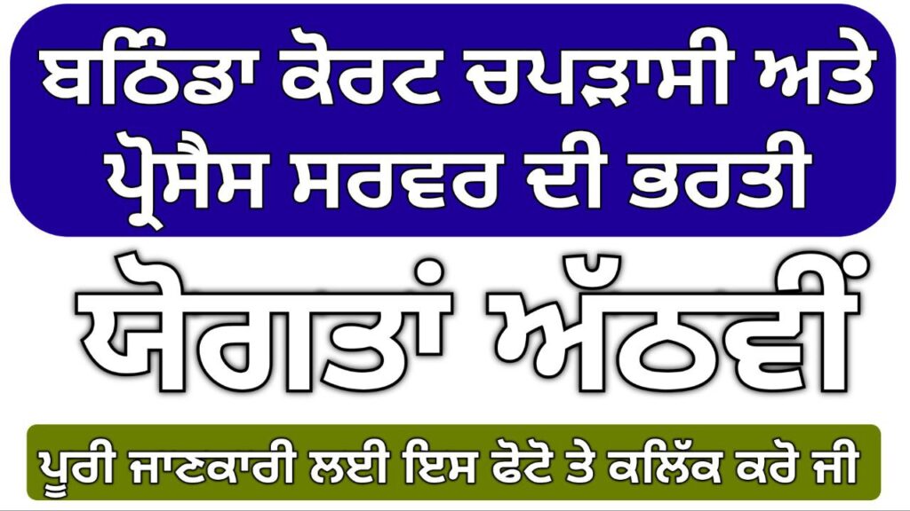 Short Information : Bathinda District Court Recruitment 2024: Bathinda Court has issued the latest notification for the recruitment of Peon posts. Other details of Bathinda Court Recruitment 2024, Bathinda Court Peon Jobs 2024, Bathinda Court Process Server Recruitment 2024 Like Age Limit, Educational Qualification, Selection Process, Application Fee, and How to Apply are given below…