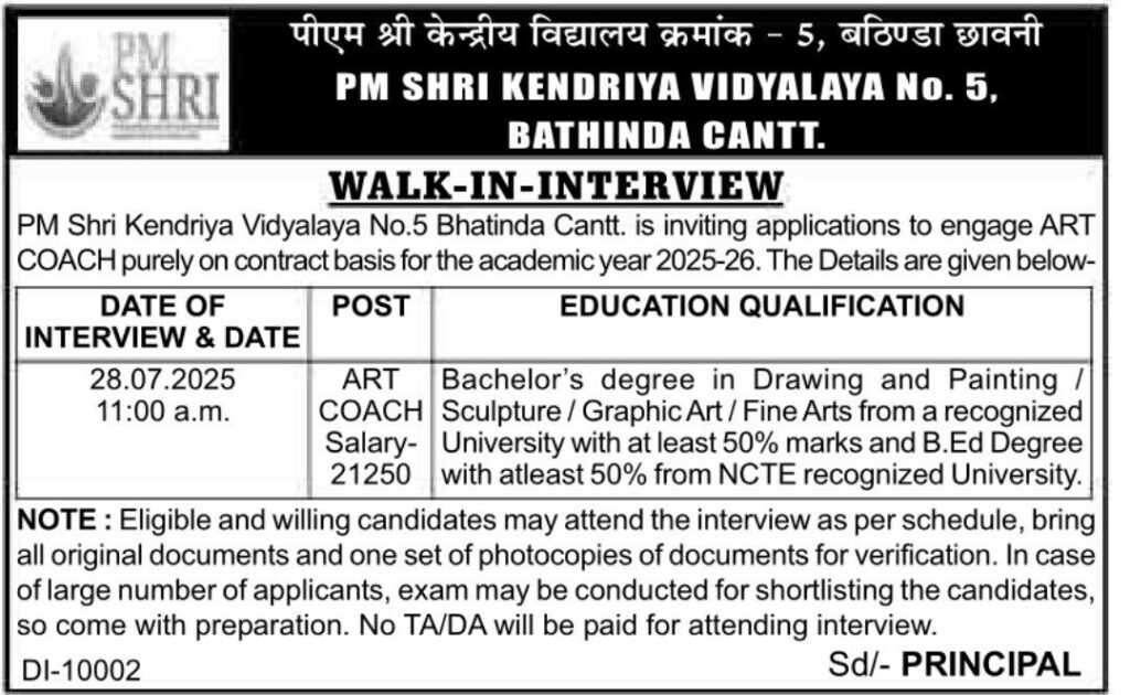| ART COACH | Not Given | Bachelor’s degree in Drawing and Painting / Sculpture / Graphic Art/Fine Arts from a recognized University with at least 50% marks and B.Ed Degree with atleast 50% from NCTE recognized University. | |||||||||||