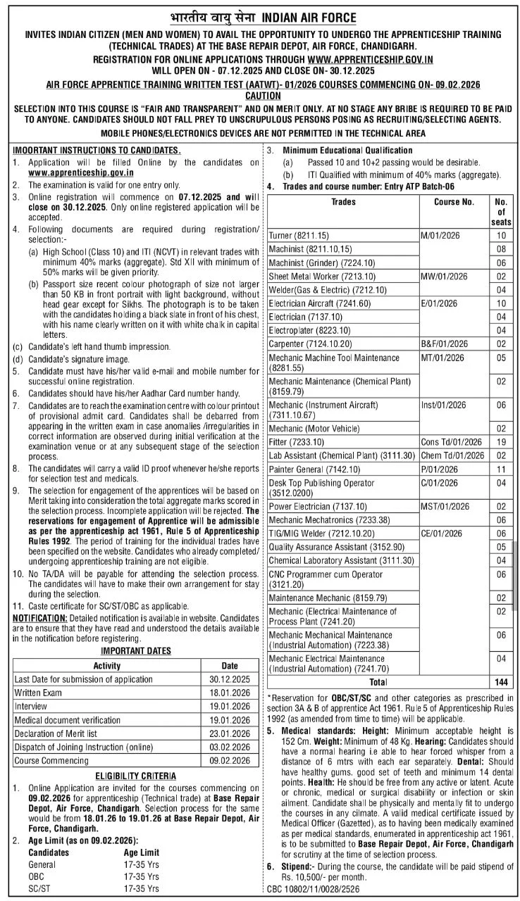 Indian Air Force (Base Repair Depot, Chandigarh)Apprentice (144 Post) Recruitment 2025Short Details Of Advt Notification
