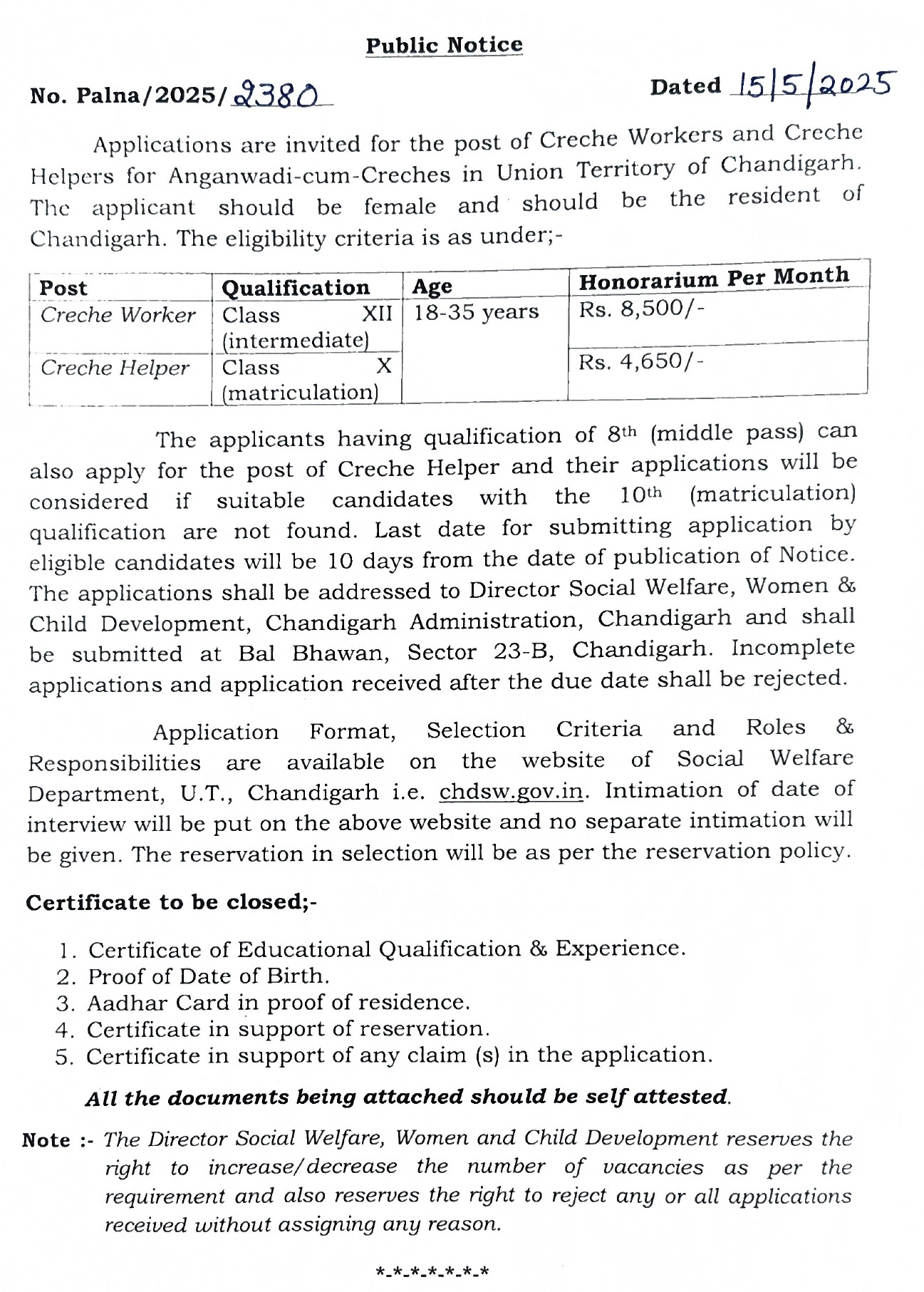 Chandigarh Anganwadi Helpers and Workers Recruitment 2025DEPARTMENT OF SOCIAL WELFARE, WOMEN & CHILD DEVELOPMENT |
