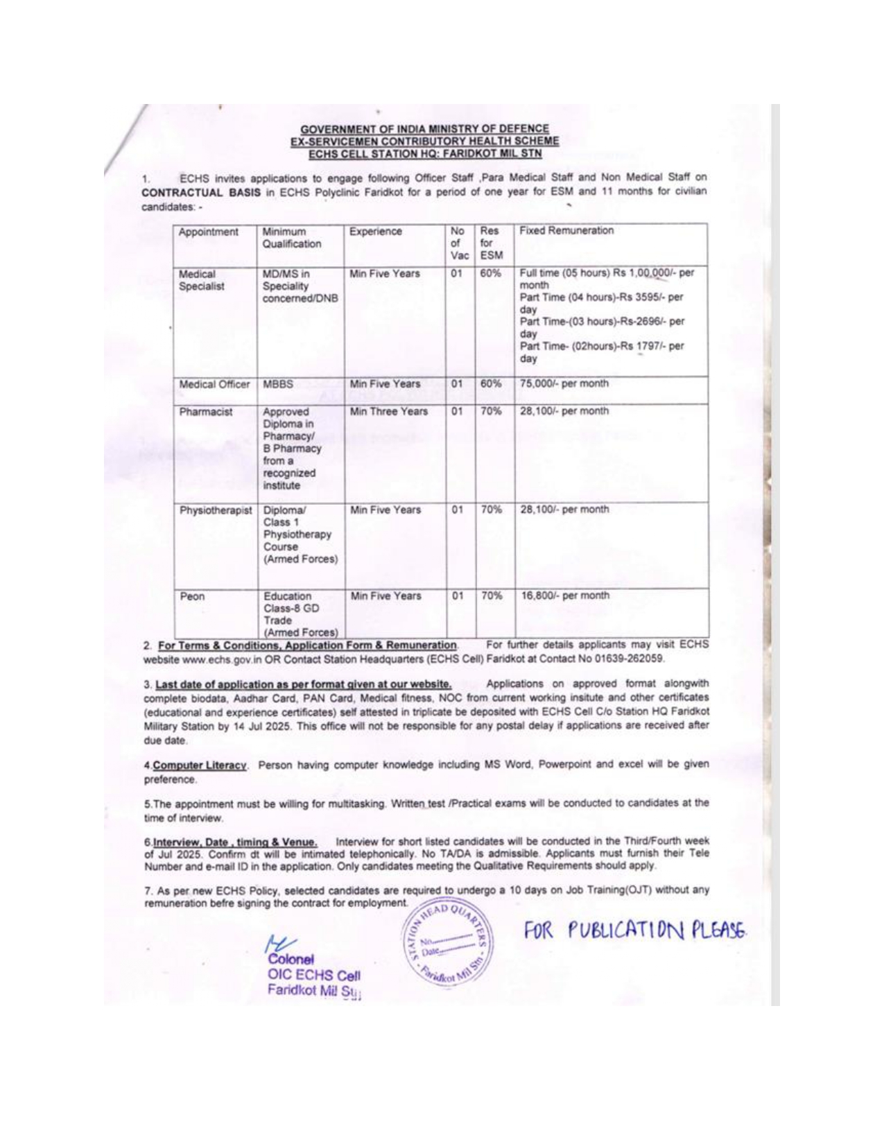 Ex-Servicemen Contributory Health Scheme (ECHS Faridkot)Peon, Pharmacist and Other Vacancy 2025www.RozgarNews.Com