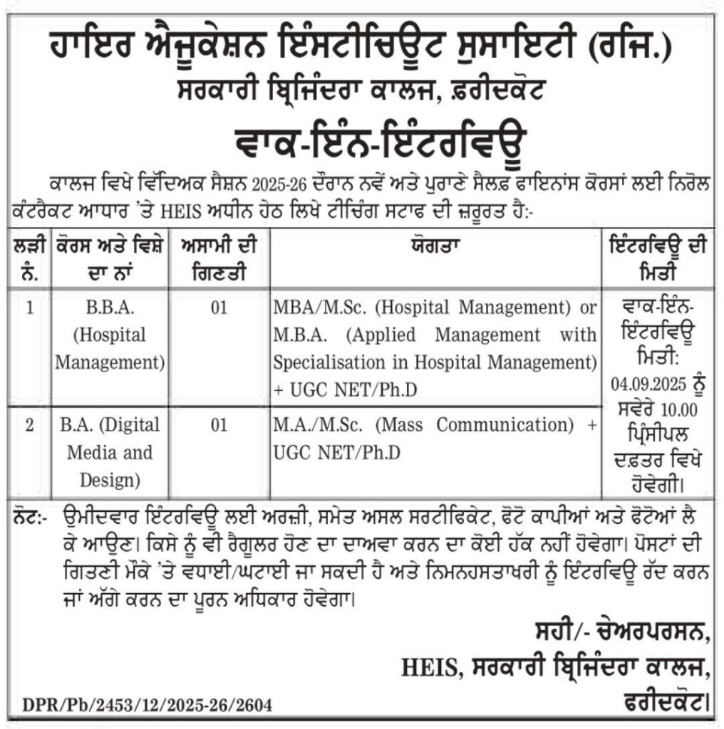 Higher Education Institute Society (Regd.)Government Brijindra College, FaridkotGovt Brijindra College Faridkot HEIS Post 2025Walk-in-InterviewTeaching staff Postwww.RozgarNews.Com