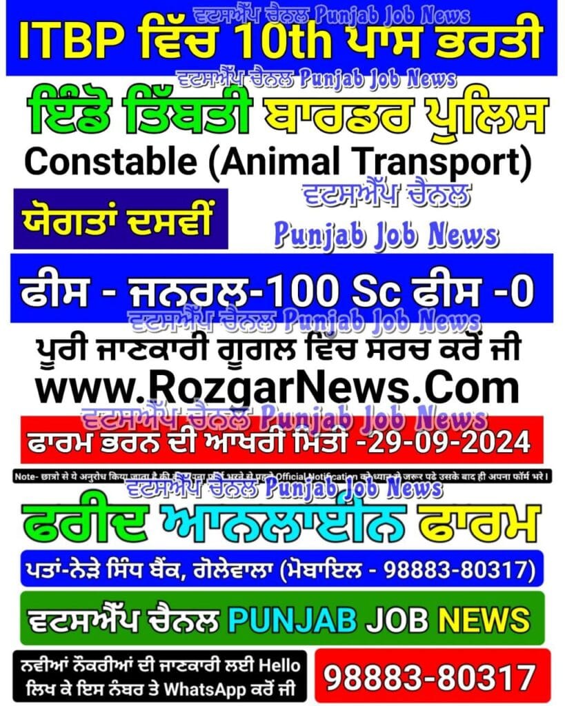 Indo Tibetan Border Police (ITBP)Veterinary Staff Recruitment 2024Short Details of Advt Notificationwww.RozgarNews.Com