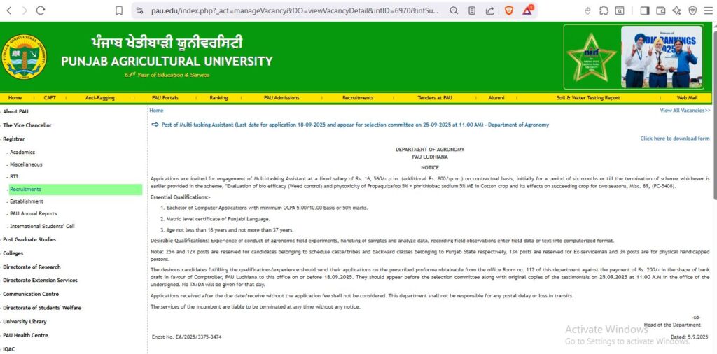 Punjab Agricultural University (PAU)Department of AgronomyMulti-tasking Assistant Form 2025www.RozgarNews.Com