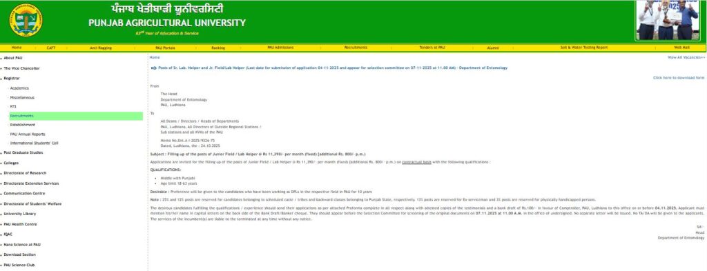 Punjab Agricultural University (PAU)Department of EntomologyLudhiana PAU Junior Field & Lab Helper Form 2025www.RozgarNews.Com