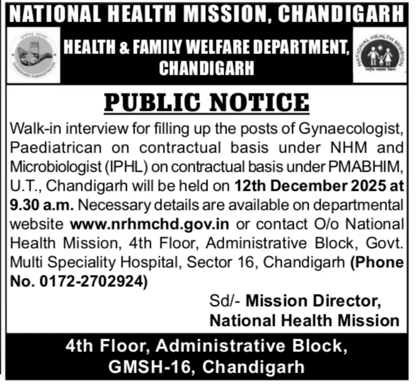 National Health Mission, Chandigarh Health & Family Welfare Department, ChandigarhGynaecologist, Paediatrician,Recruitment 2025