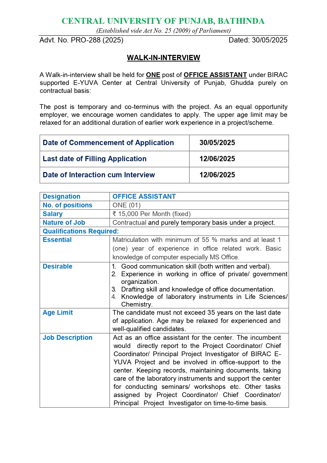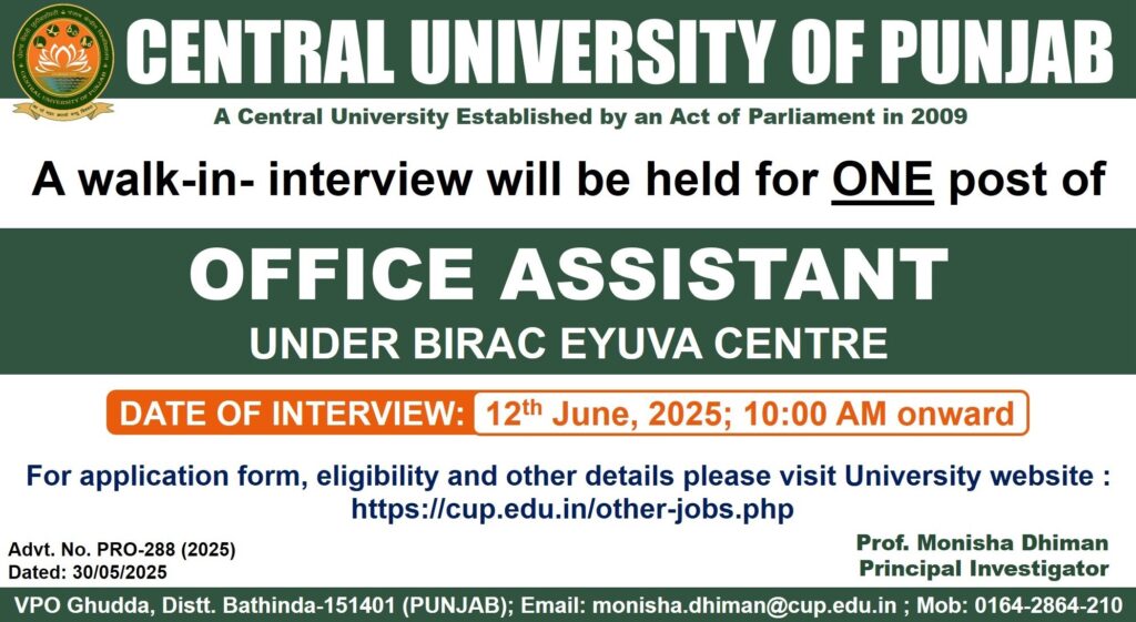 Punjab Central University Bathinda Recruitment 2025Office Assistant Recruitment 2025┬аShort Details PRO-288 (2025)www.RozgarNews.Com