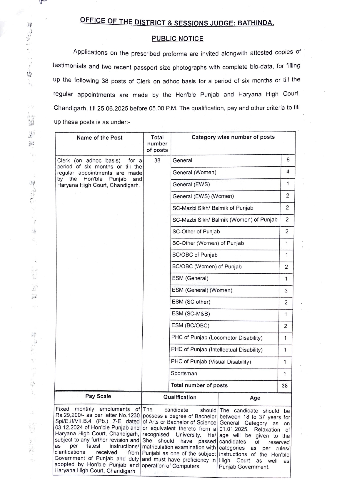 | Clerk on Adhoc basis | 38 | The candidate should possess a degree of Bachelor of Arts or Bachelor of Science or equivalent thereto from a recognised University. He/ She should have passed matriculation examination with Punjabi as one of the subject and must have proficiency in operation of Computers. |