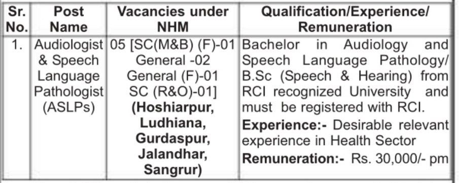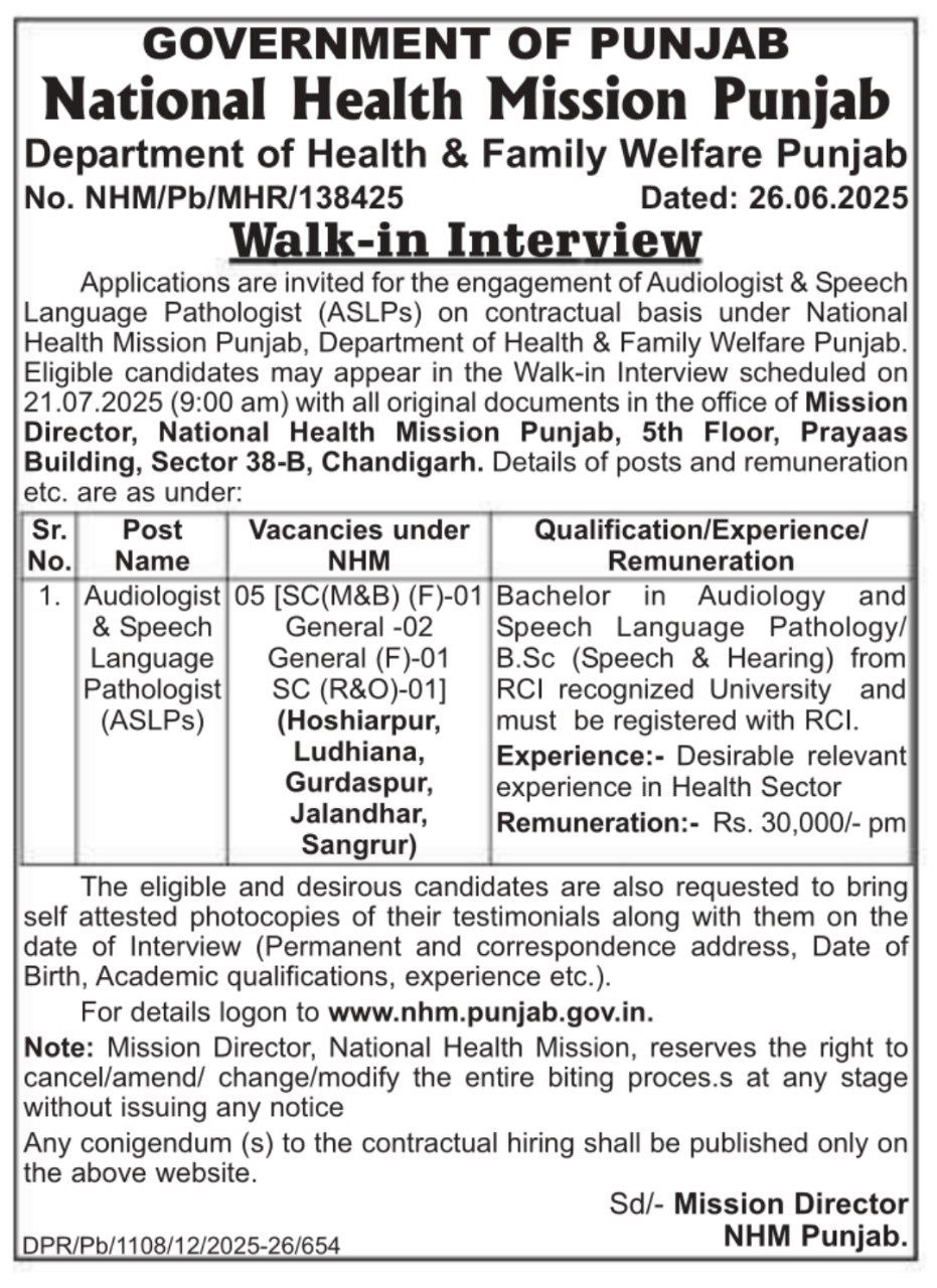 National Health Mission PunjabPunjab National Health Mission ASLPs RecruitmentDepartment of Health & Family Welfare Punjab |