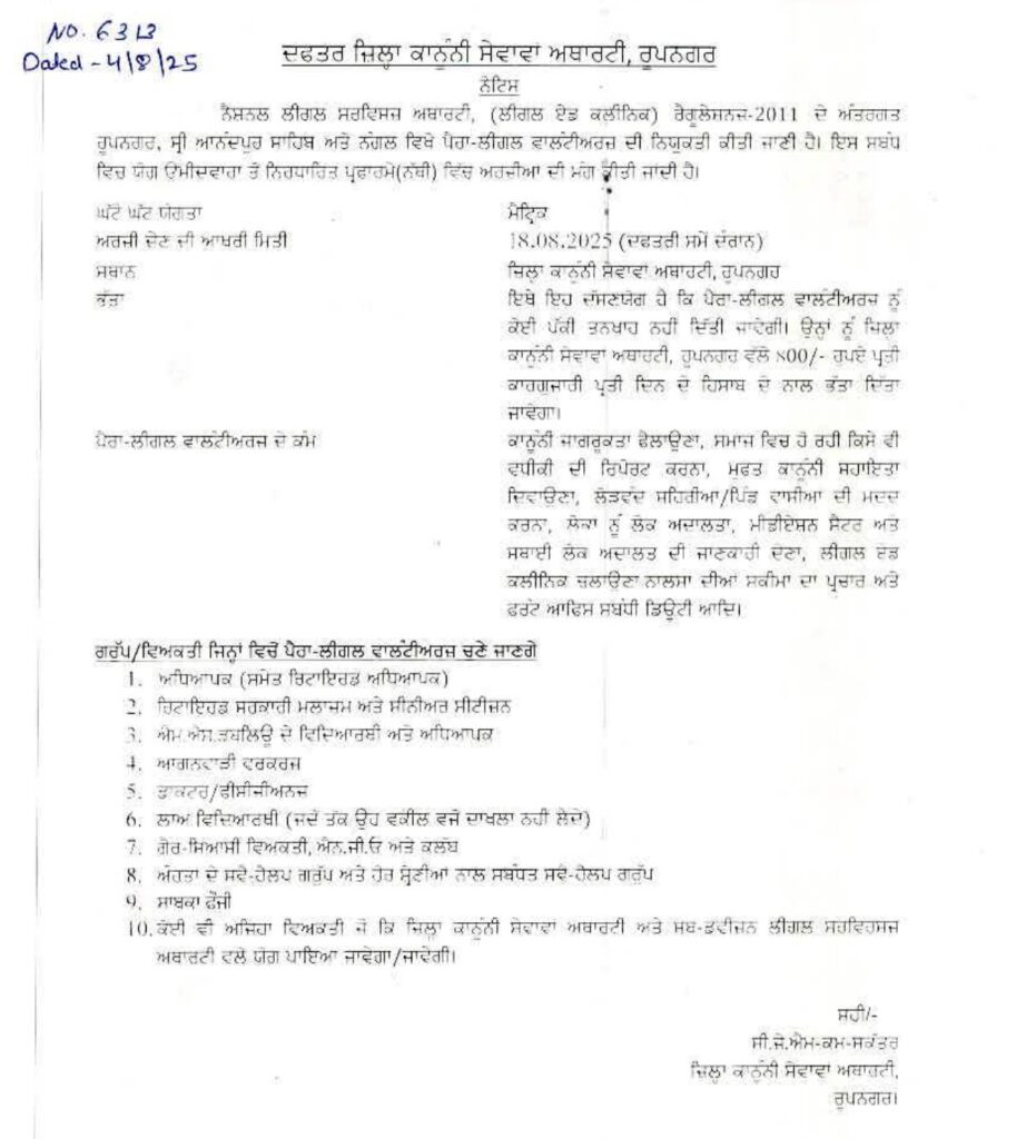 District Legal Services Authority, RupnagarPara Legal Volunteers Recruitment2025Short Detailswww.RozgarNews.Com