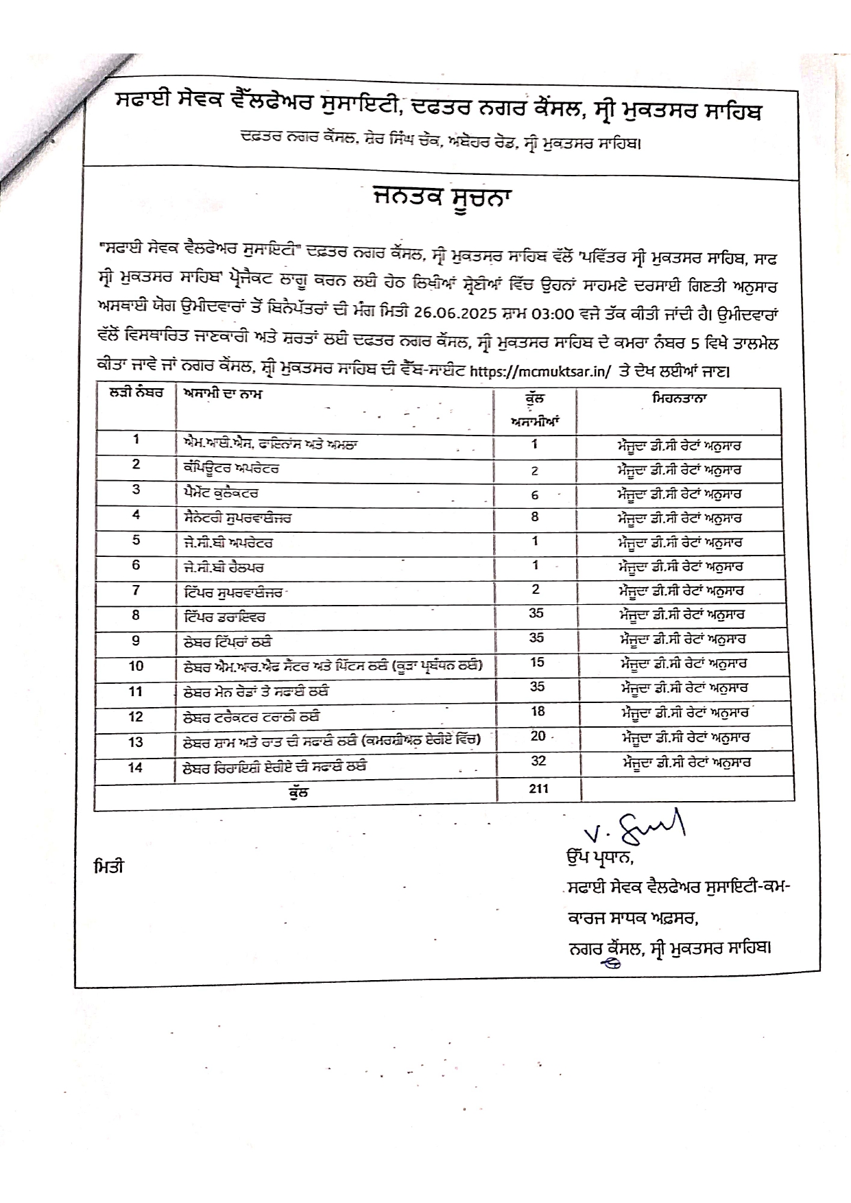 Punjab Safai Sewak Welfare Society Recruitment 2025Safai Sevak Welfare Society Office Municipal Council, Sri Muktsar SahibComputer Operator, Sanitary Supervisor and Various PostShort Detailswww.RozgarNews.Com