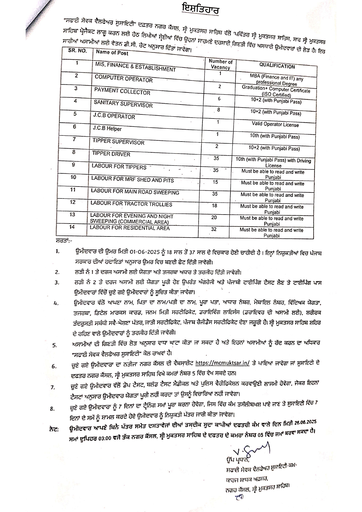 | LABOUR FOR MAIN ROAD SWEEPING | Must be able to read and write Punjabi |