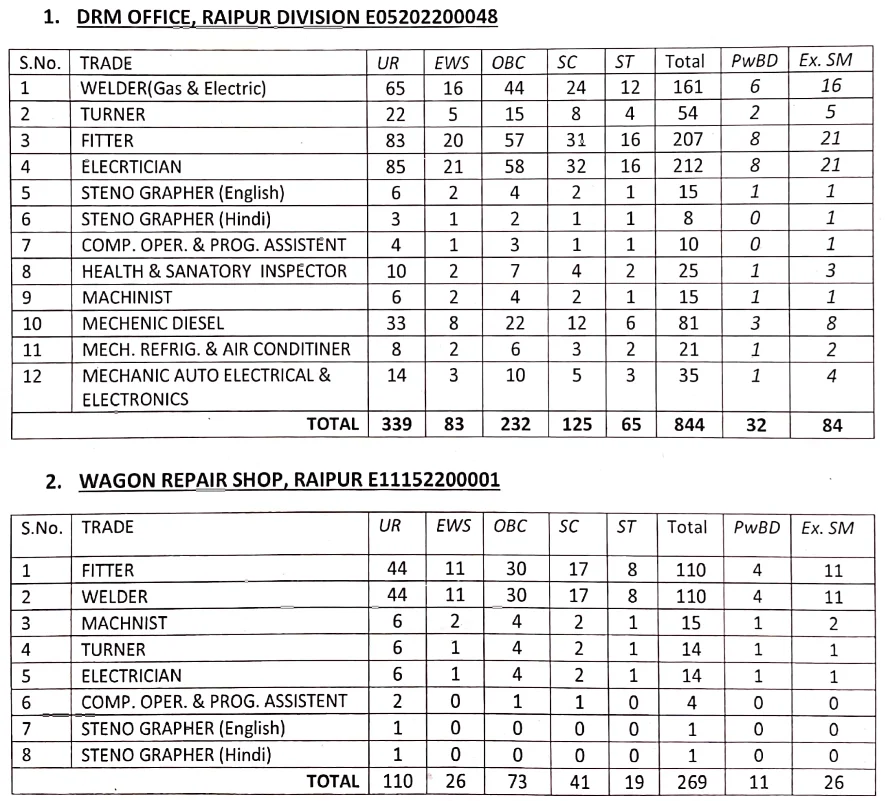 Railway Recruitment Cell, South East Central RailwayITI Trade Apprentice Recruitment 2024Short Details of Advt Notification |