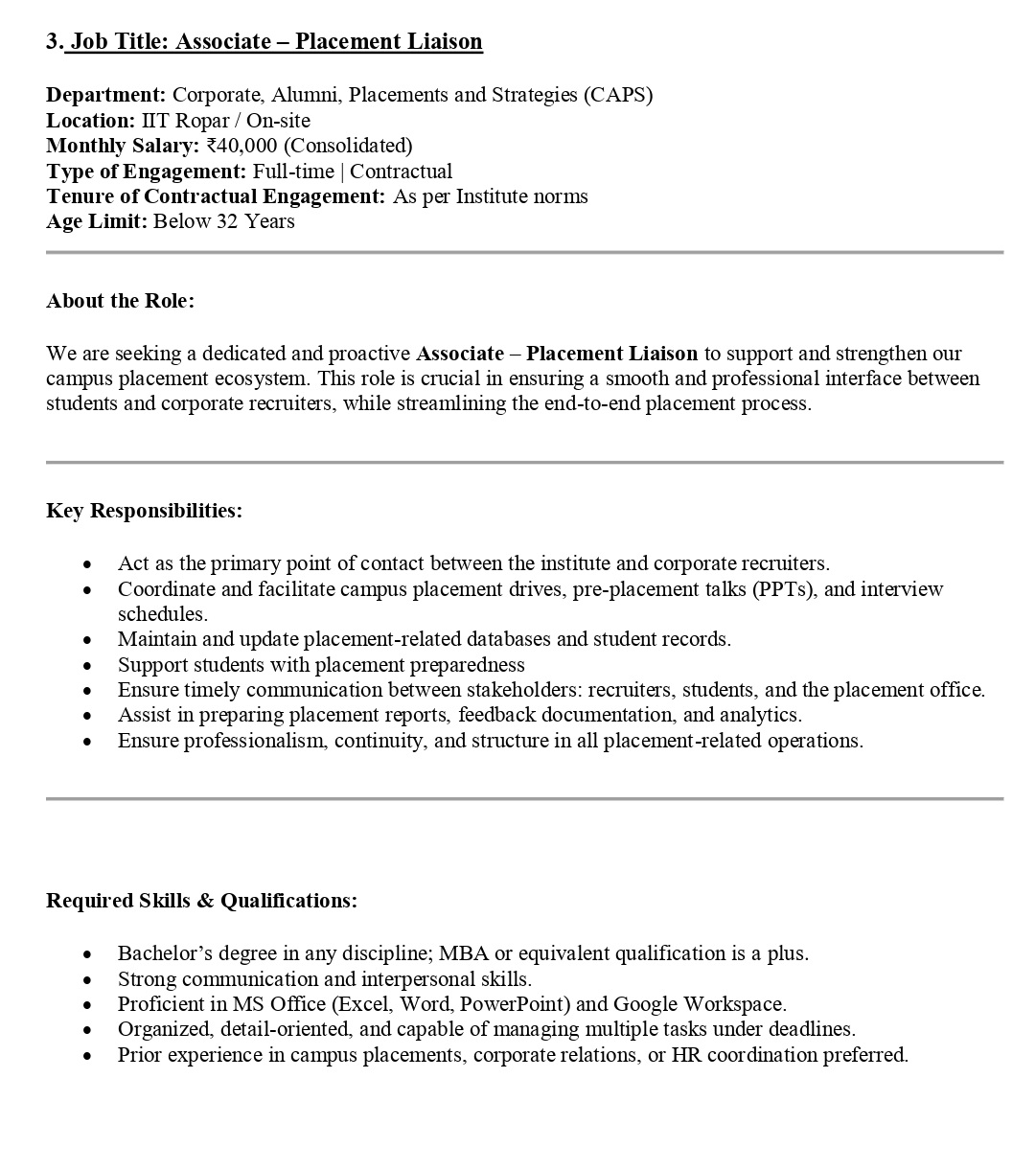 - Associate – Placement Liaison Age Limit: Below 32 Years